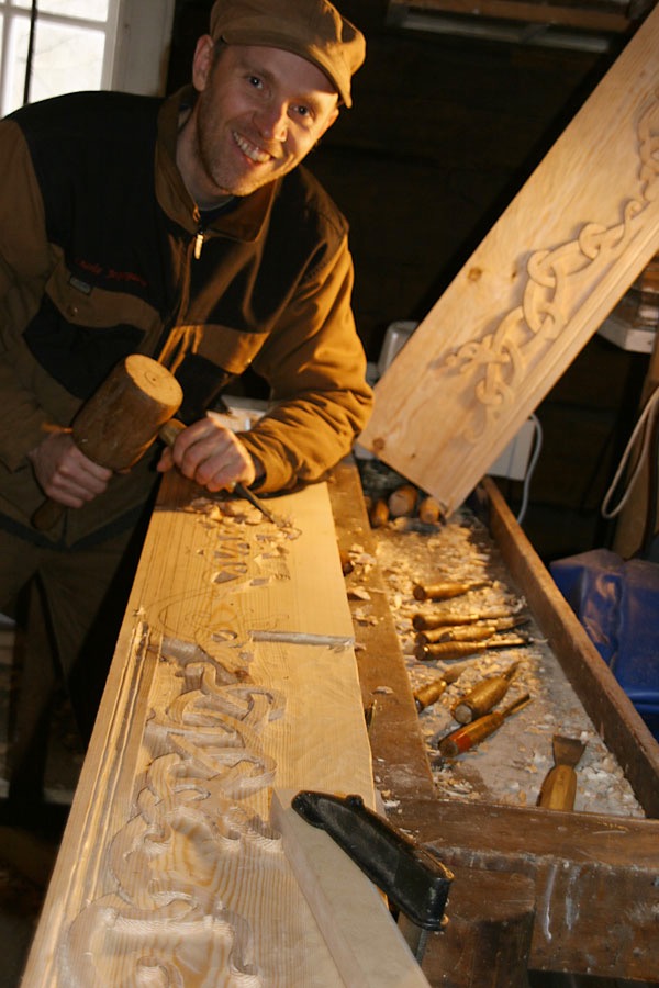 Ursprungligen började jag min verkan i Danmark med ett stort fokus på vikingatidens träsniderier och kraftfulla ornamentik. Det finns en otrolig rikedom i denna gamla kultur som jag fortfarande använder i mitt arbete här i Finland. Ett bra exempel på hur jag integrerar träsnideri med naturligt byggande finns i The Dragon Temple, Fagervik. Jag hittar också inspiration direkt från naturen där jag försöker att uttrycka naturens själ.